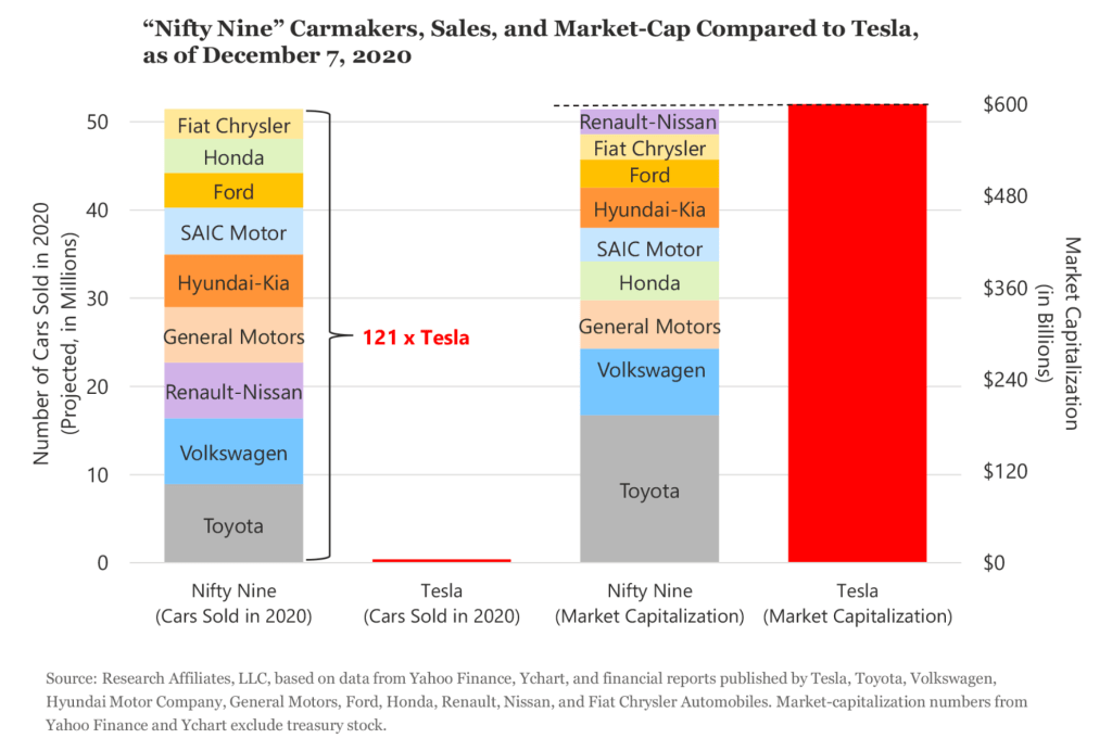 Tesla’s Market Cap is just absurd: Again, people will think that I don’t like Tesla, etc. I don’t have a problem with Tesla, but I have a problem with the valuations. Tesla’s market cap is equal to or larger than the 9 biggest auto companies in the world combined, despite the fact those 9 firms have sold 121x more cars than Tesla has in 2020!! Essentially, people are saying that no one will compete with Tesla in the future (to me this is beyond comprehension).
