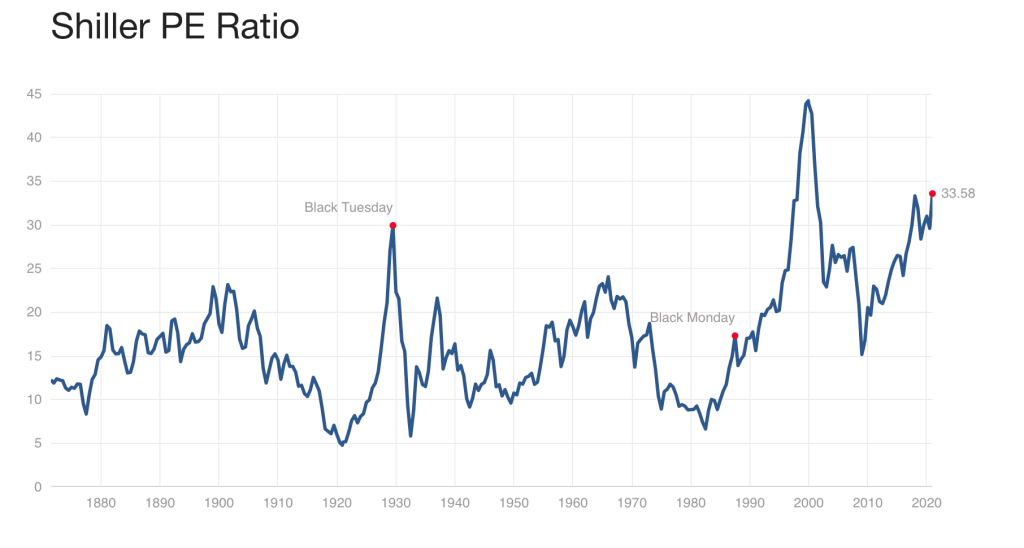 2- The Shiller CAPE Ratio which is defined as price divided by the average of ten years of earnings, adjusted for inflation and is used by investors to see whether the stock market is overpriced or underpriced and extrapolate future returns based on historical averages is currently above 33 which is higher than the S&P 500 historical average of roughly 17.