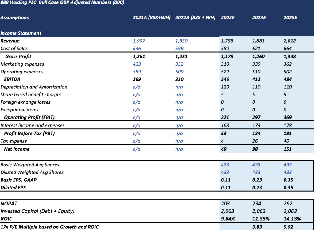 - The stock is currently trading at £0.72 per share which is 6x 2023 Earnings and 5x 2023 EBITDA respectively. This is a significant discount to the company’s historical median valuations of 15x forward P/E and 13x forward EV/EBITDA and more than 50% discount to industry peers (the other big 3) namely Flutter Entertainment plc, Entain plc, and DraftKings. Our base case scenario assumes revenue growth of -5% in line with management guidance and consensus estimates for 2023 and 5% after that driven by a combination of slower growth in core markets and faster growth in optimize and new markets to reach £1.93 billion in 2025 below the management target of above £2 billion. We expect ROIC to reach 12% in 2024 and exceed our WACC of 10% driven by the realization of synergies leading to NOPAT expansion. In addition, Management is expecting FCF to turn positive in 2024. We expect EPS in 2025 to be £0.3 (20% below management guidance). We are applying a justified 12x P/E in 2025 based on Growth Rate and ROIC (lower than the historical median of 17x) to get a £3.6 price per share which represents 500% return based the current market price of £0.72 per share. Our bear case scenario assumes Revenue growth of -5% per year through 2025 more than the combined drop in revenue of 2% during the GFC to reach £1.6 billion in 2025. No successful deleveraging and no flexibility in slashing marketing expenses to get a value of £0 per share. Our bull case scenario is in line with the management guidance of 7% revenue growth in 2024 and 2025 combined with >23% EBITDA margin and 0.35 EPS. We are modeling ROIC close to 15% and applying a multiple of 17x P/E multiple to yield £6 price per share or ~800% return. Applying a 70% weight to our base case scenario and 15% to both the bear and bull case scenario yields a price target of £3.4 in 2025 or a ~500% increase from today’s price. All our scenarios apply a 2% increase in interest rates over the next 2 years. We believe this opportunity offers an attractive Risk/Reward profile for patient investors over the next 2-3 years.